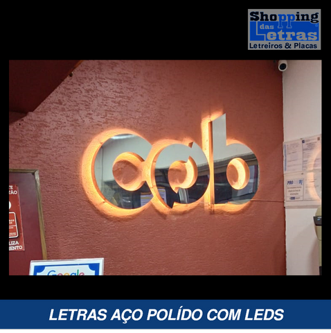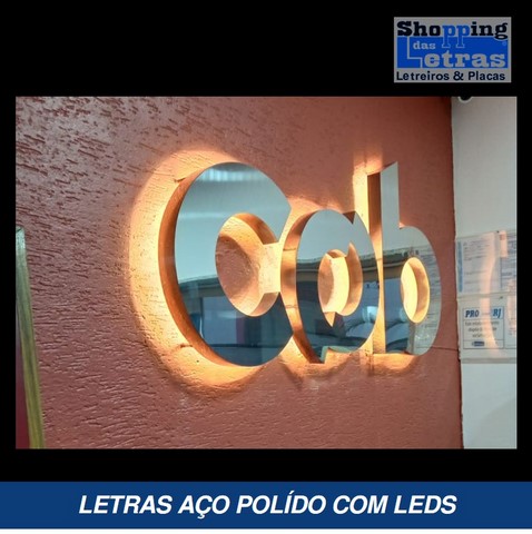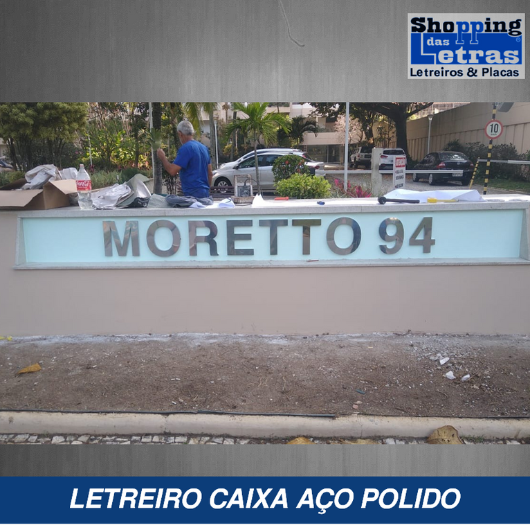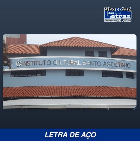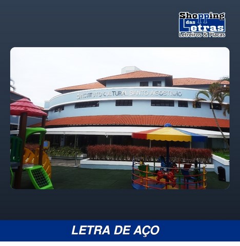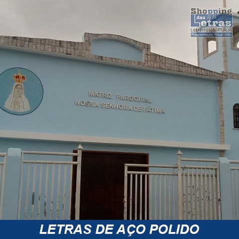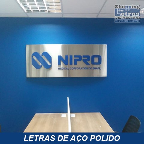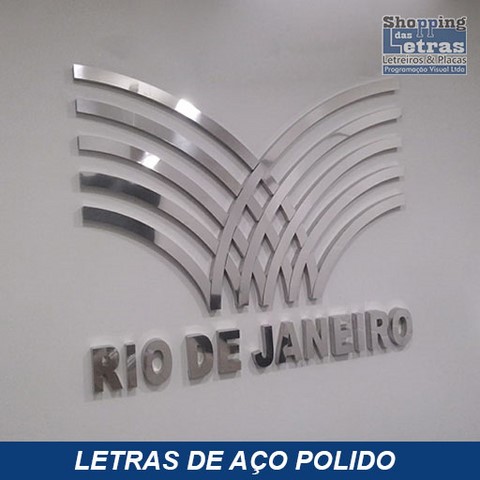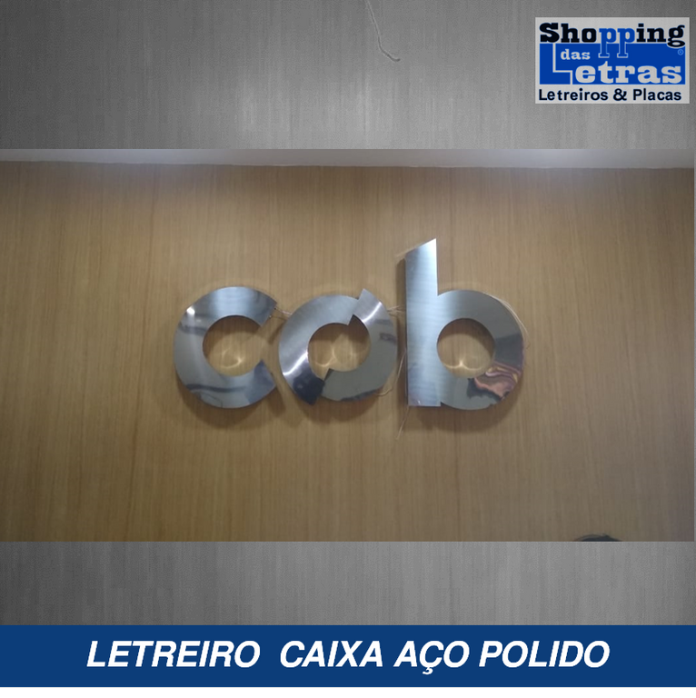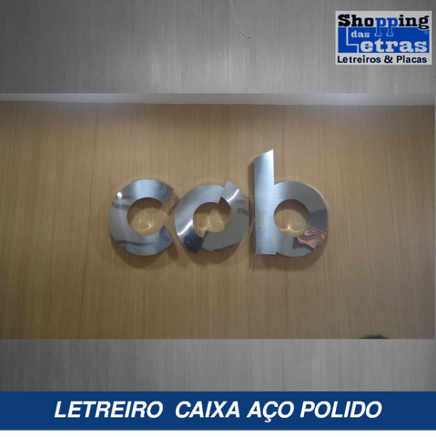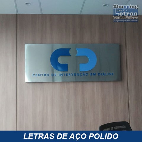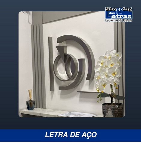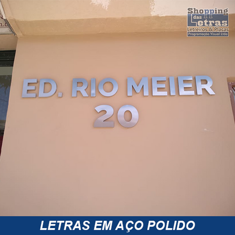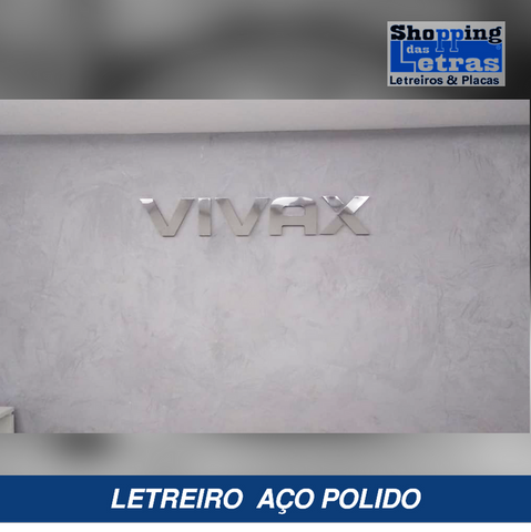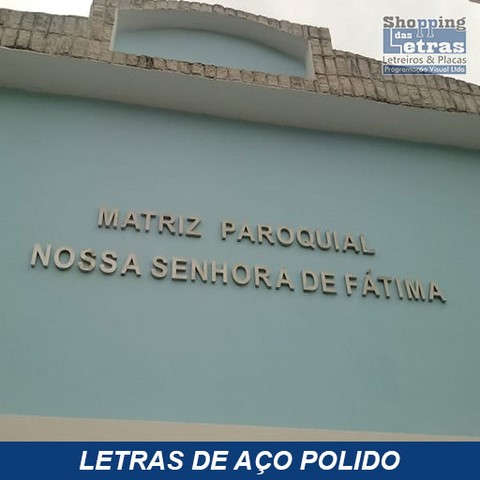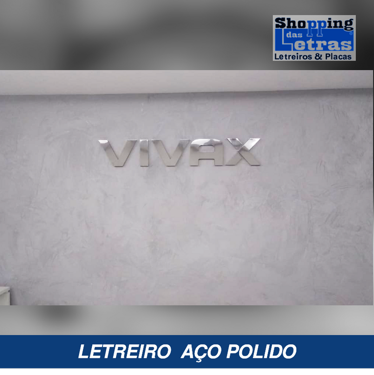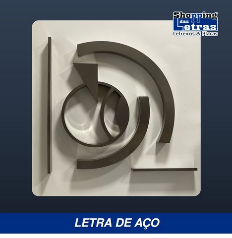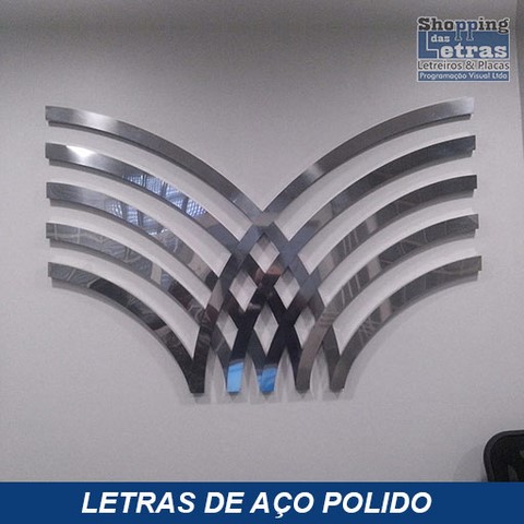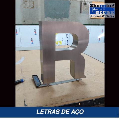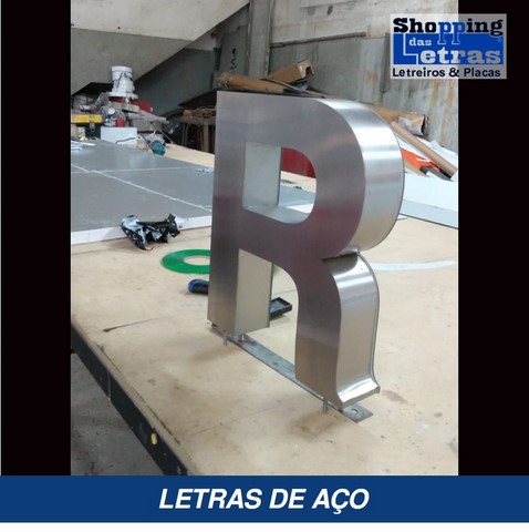 Aço escovado ou polido inoxidável ( qualidade 304 ) confeccionadas a base de recorte a laser, montadas com soldas 50×50, lateral ( espessura ) de acordo com o tamanho das letras, fixação a base de pinos central, orelhas com ou sem afastamento, base para colar com fita dupla face ou cola especial. Para espessuras maiores que 25mm o acabamento é feito com tinta PU automotiva, fixadas a base de fita dupla face da 3m ou cola especial, podendo também ser com pinos central.