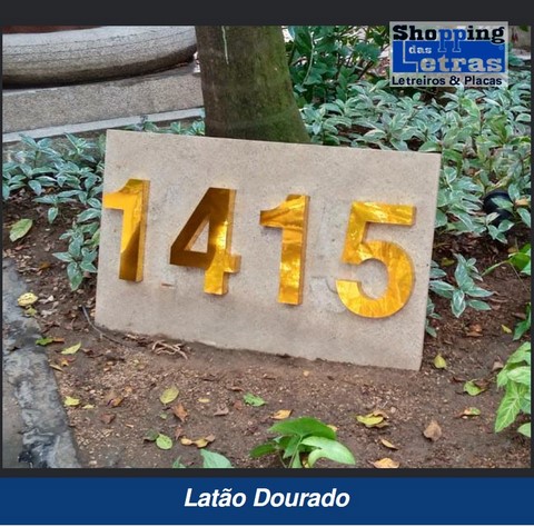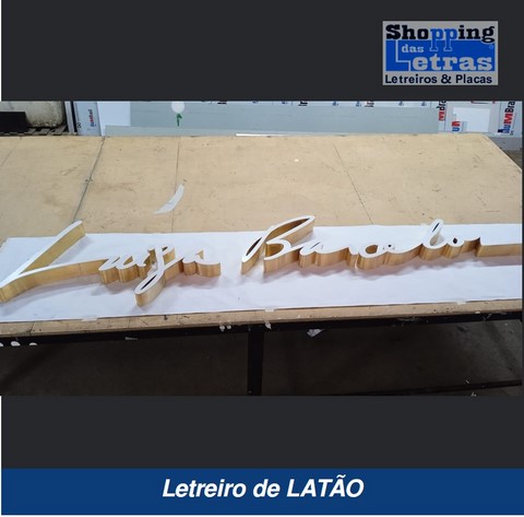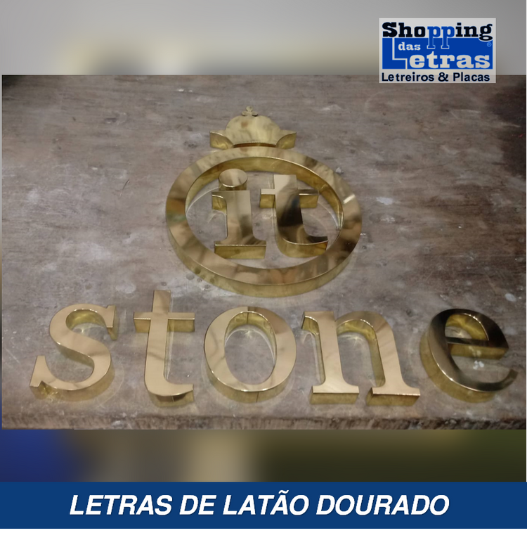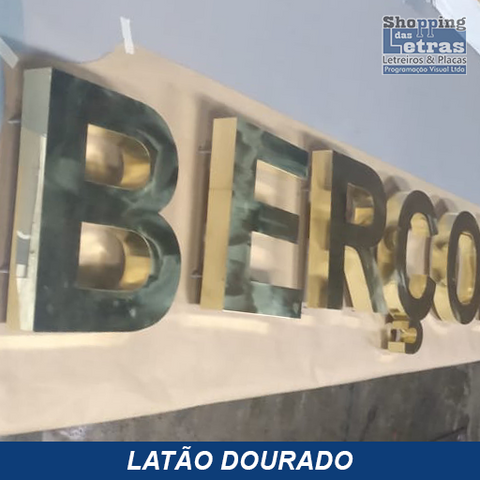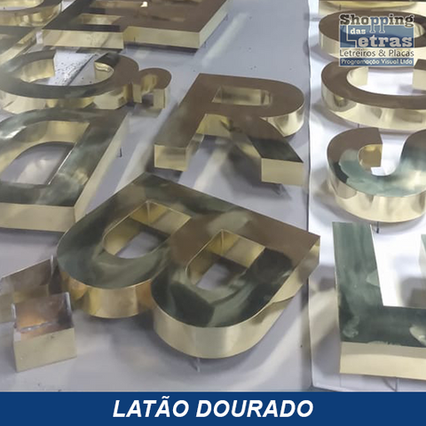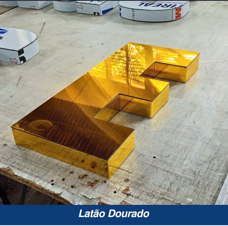 Latão polido (Dourada), confeccionadas a base de recorte a laser, montadas com soldas 50×50, lateral ( espessura ) de acordo com o tamanho das letras e logomarca, fixação a base de pinos normais, orelhas com ou sem afastamento, base para colar com fita dupla face ou cola especial.