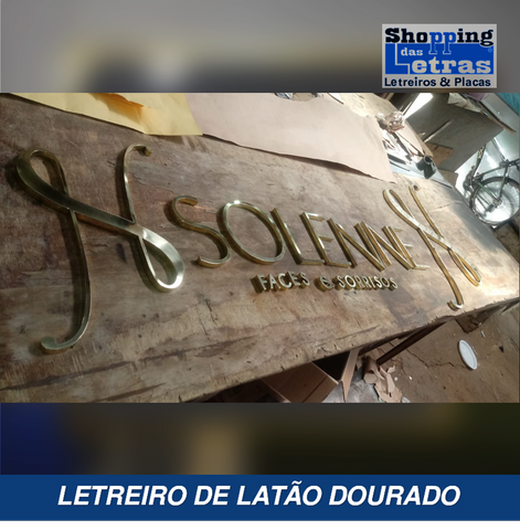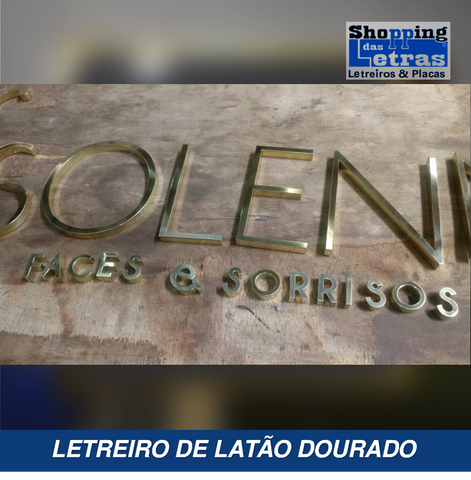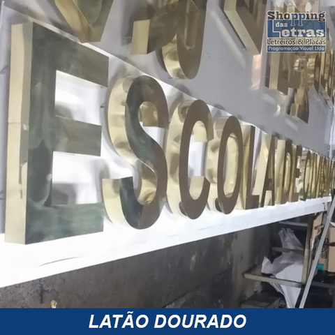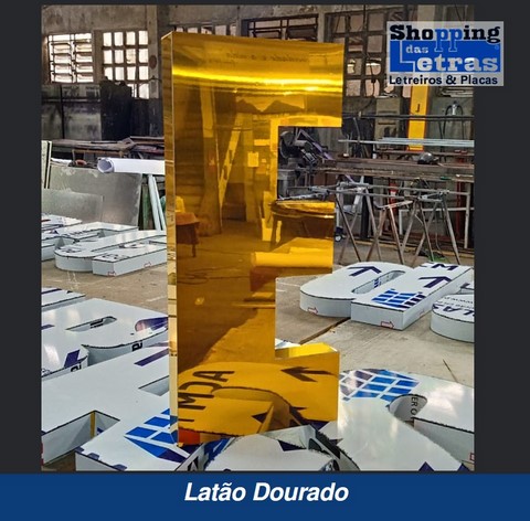 Latão polido (Dourada), confeccionadas a base de recorte a laser, montadas com soldas 50×50, lateral ( espessura ) de acordo com o tamanho das letras e logomarca, fixação a base de pinos normais, orelhas com ou sem afastamento, base para colar com fita dupla face ou cola especial.